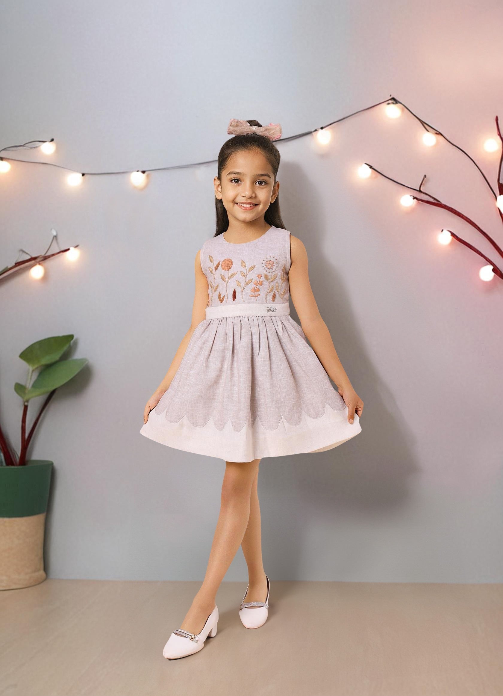 A beautiful linen dress with great embroidery, round neck, zip closure, and a back tie, perfect for any occasion.