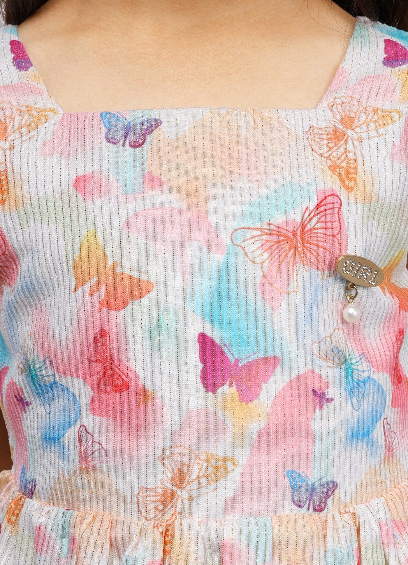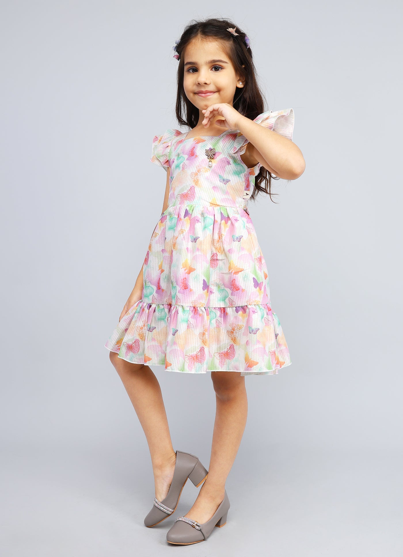 A stylish digital print dress with a round neck, zip closure, and a sweet back tie, perfect for both casual and special occasions.